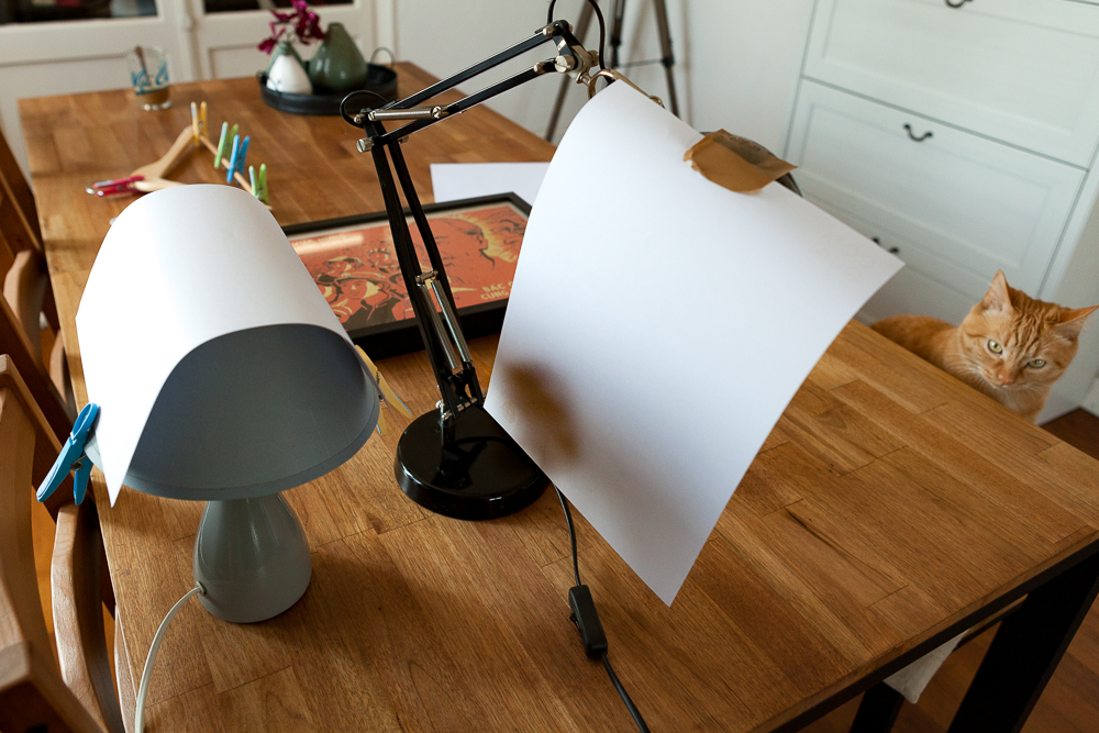 Le manque de puissance des ampoules empêche de faire rebondir la lumière sur une surface blanche, on va donc se faire des softbox de fortune en scotchant nos feuilles A4 comme ceci :