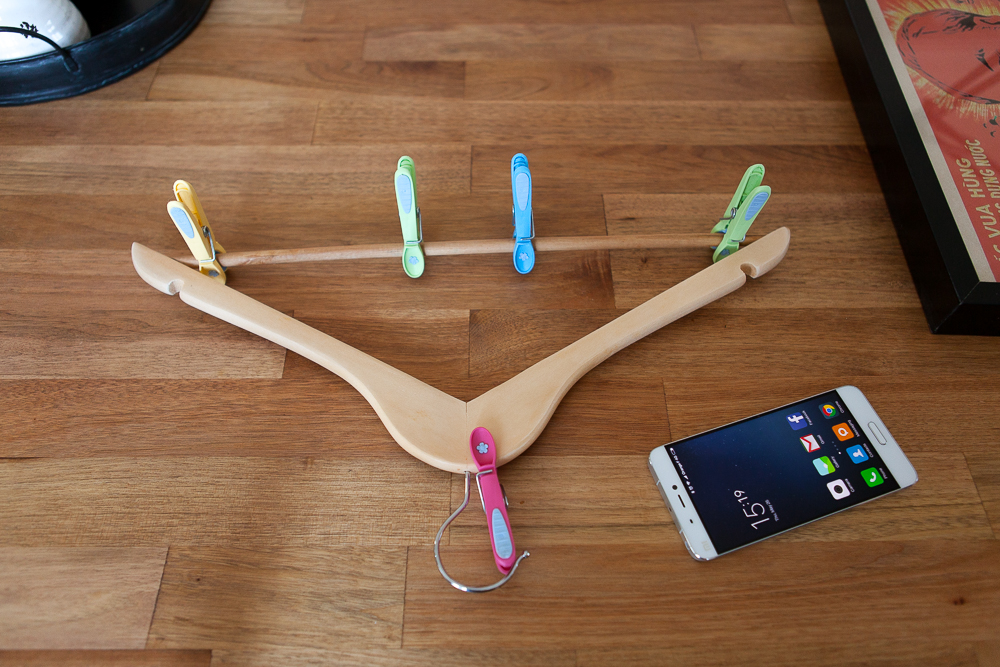 Hors de question de shooter à main levée, il me faut donc un trépied, et c’est là qu’interviennent les épingles et le cintre.